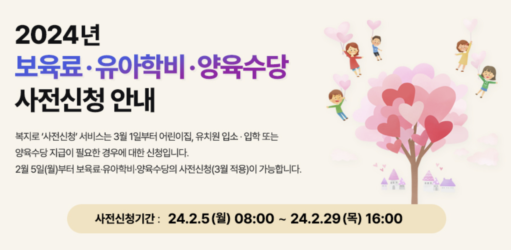 2024년 영유아 보육 서비스 사전 신청 기간은 24.2.5 (월) 08:00 ~ 24.2.29 (목) 16:00 까지