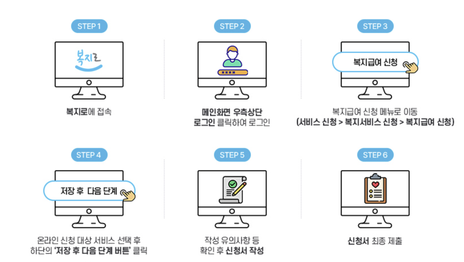 PC, 스마트폰에서 복지로 누리집(www.bokjiro.go.kr) 접속 또는 복지로 모바일앱에서 신청 가능.